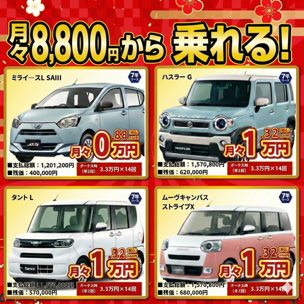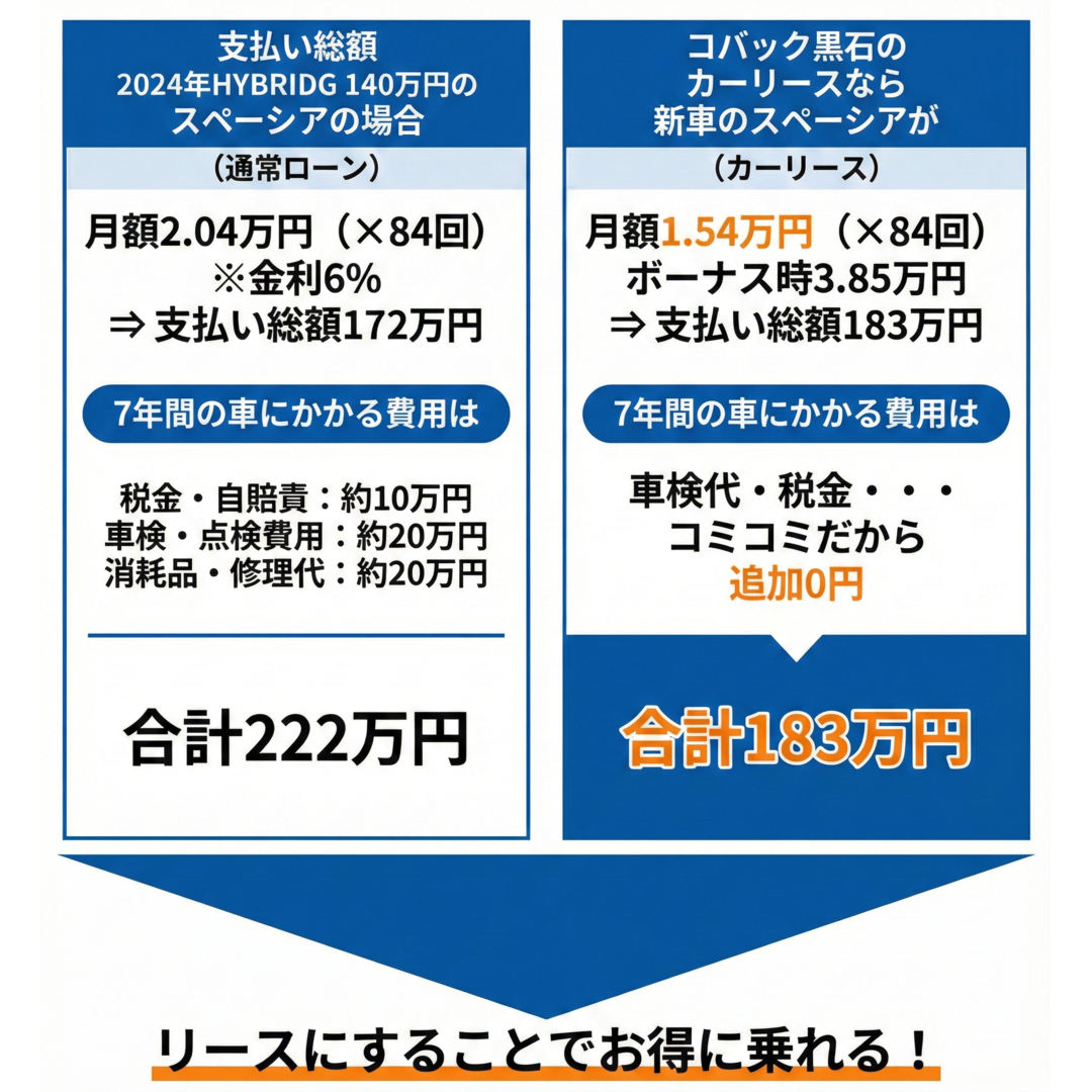 この軽のコバック黒石店は、リース期間後にも4つ選択肢がありボーナスまで一定金額の支払いなので非常にわかりやすかったです。