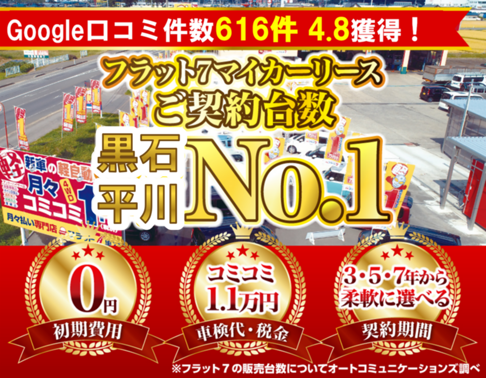 そのため実際の月々は割高にはなりません。設定残価はリースアップ時の売却予定価格ですので、フラット7では、人気車種に絞って高い残価を設定しました。